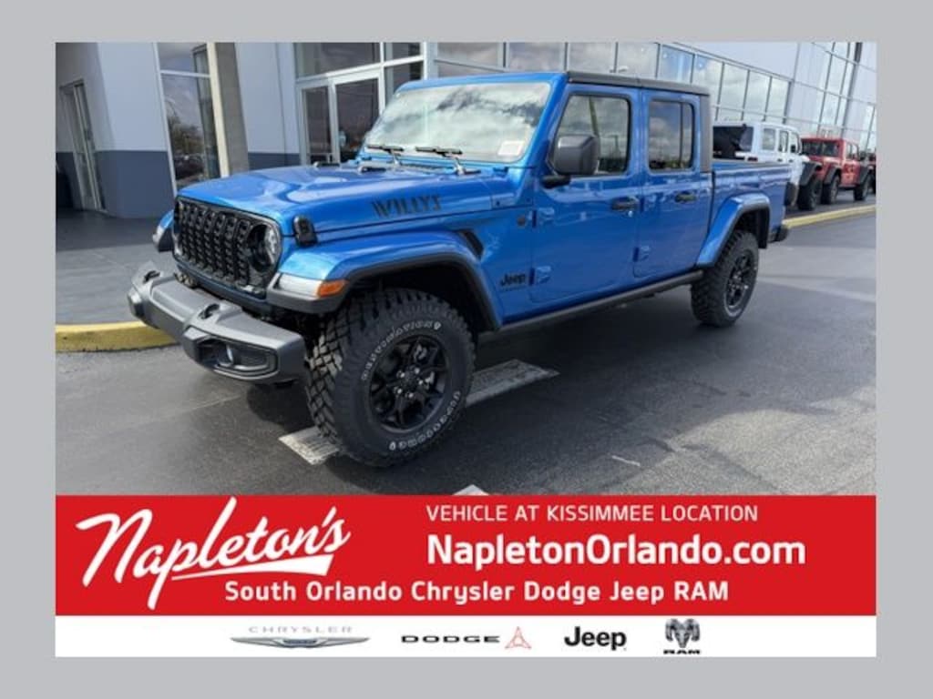 This Gladiator is well equipped with Convenience Group (Air Conditioning with Auto Temp Control, Cluster 7.0" TFT Color Display, Corning Gorilla Glass, Daytime Running Lamp System, Emergency/Assistance Call, Front Door Locks 2-Door Passive Entry, Heated Front Seats, Heated Steering Wheel, Remote Start System, and Universal Garage Door Opener), Quick Order Package 24W Willys (2-Piece Body Color Fender Flares, 4-Wheel Drive Decal, Advanced Brake Assist, Automatic Headlamps, Auxiliary Switches, Black Grille with Gloss Black Rings, Class IV Receiver Hitch, Daytime Running Lamps LED Accents, Deep Tint Sunscreen Windows, E-Locker Rear Axle, Front Heavy Duty Red Accent Shock Absorbers, Front LED Fog Lamps, Full Speed Forward Collision Warning Plus, Heavy-Duty Engine Cooling, LED Premium Reflector Headlamps, LED Taillamps, Mold in Color Bumper with Gloss Black, MOPAR All-Weather Slush Mats, Off-Road Plus Mode, Power Heated Mirrors, Premium Wrapped Steering Wheel, Protection Sill Rails, Rear Heavy Duty Red Accent Shock Absorbers, Security Alarm, Sun Visors with Illuminated Vanity Mirrors, Trailer Hitch Zoom, Wheels: 17" x 7.5" Painted Black, Willys Hood Decal, and Willys Suspension), Safety Group (Auto High Beam Headlamp Control, Blind Spot and Cross Path Detection, and ParkSense Rear Park Assist System), 110 Mph Vehicle Max Speed Calibration, 12.3" Touchscreen Display, 3.73 Rear Axle Ratio, 4-Wheel Disc Brakes, 4G LTE Wi-Fi Hot Spot, 8 Speakers, ABS brakes, Air Conditioning, Alexa Built-in, AM/FM radio: SiriusXM with 360L, Apple CarPlay, Apple CarPlay/Android Auto, Black 3-Piece Hard Top, Brake assist, Compass, Connectivity - US/Canada, Delay-off headlights, Driver door bin, Driver vanity mirror, Dual front impact airbags, Dual front side impact airbags, Electronic Stability Control, For Details, Visit DriveUconnect.com, Freedom Panel Storage Bag, Front anti-roll bar, Front Bucket Seats, Front Center Armrest w/Storage, Front fog lights, Front reading lights, Google Android Auto, Illuminated entry, Integrated Center Stack Radio, Integrated roll-over protection, Low tire pressure warning, Manufacturer's Statement of Origin, Normal Duty Suspension, Occupant sensing airbag, Outside temperature display, Overhead airbag, Panic alarm, ParkView Rear Back-Up Camera, Passenger door bin, Passenger vanity mirror, Power steering, Power windows, Radio data system, Radio: Uconnect 5 with 12.3" Display, Rear anti-roll bar, Rear reading lights, Rear Sliding Window, Rear Window Defroster, Remote keyless entry, SiriusXM Radio Service, SiriusXM with 360L, Speed control, Split folding rear seat, Steering wheel mounted audio controls, Tachometer, Telescoping steering wheel, Tilt steering wheel, Traction control, Trip computer, USB Host Flip, Variably intermittent wipers, Voltmeter, and Wheels: 17" x 7.5" Black Steel Styled. Not all customers qualify for all rebates. See dealer for details. Price includes: $1000 - 2026 National Retail Bonus Cash . Exp. 03/31/2026 $500 - 2026 National 2026 First Responder Bonus Cash . Exp. 01/04/2027