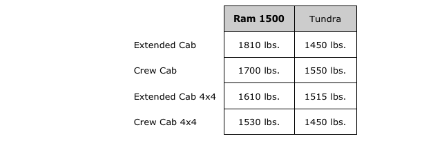The Ram 1500's front to rear weight distribution is more even (56.2% to 43.8%) than the Tundra's (57.8% to 42.2%). This gives the Ram 1500 more stable handling and braking.