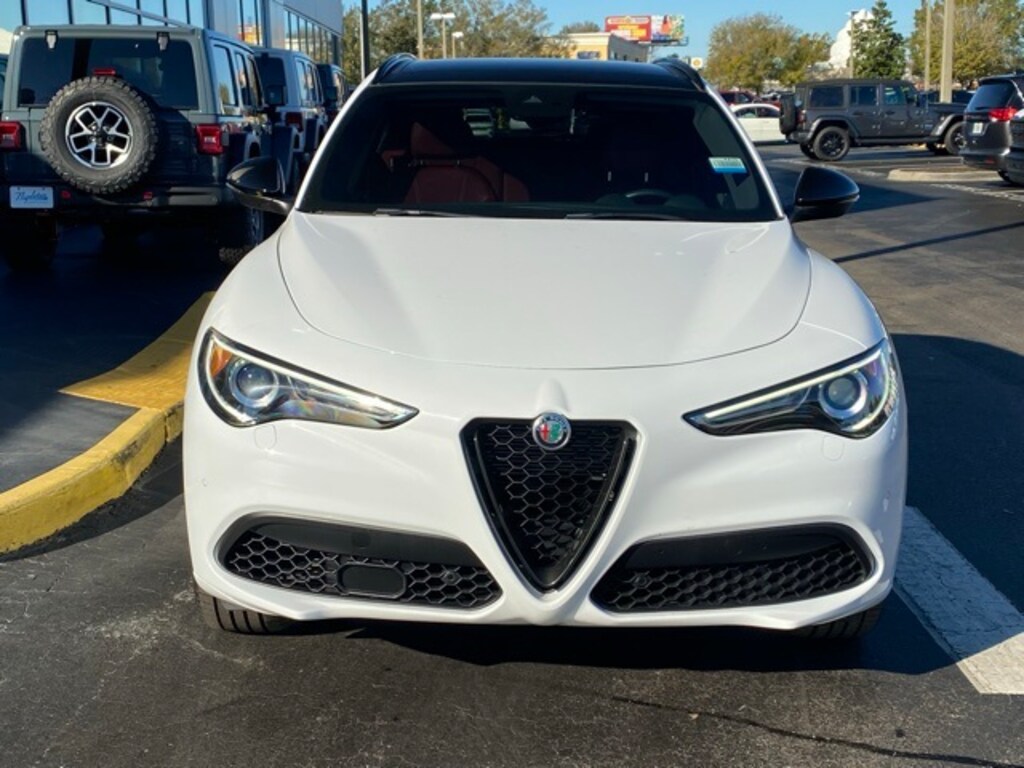 This Stelvio is well equipped with 3.73 Axle Ratio, 4-Wheel Disc Brakes, 8 Speakers, ABS brakes, Air Conditioning, Alloy wheels, AM/FM radio: SiriusXM, Apple CarPlay/Android Auto, Auto High-beam Headlights, Auto-dimming door mirrors, Auto-dimming Rear-View mirror, Automatic temperature control, Brake assist, Bumpers: body-color, Compass, Delay-off headlights, Driver door bin, Driver vanity mirror, Dual front impact airbags, Dual front side impact airbags, Electronic Stability Control, Emergency communication system: SiriusXM Guardian - included trial, Four wheel independent suspension, Front anti-roll bar, Front Bucket Seats, Front Center Armrest, Front dual zone A/C, Front reading lights, Fully automatic headlights, Garage door transmitter, Genuine wood console insert, Genuine wood dashboard insert, Genuine wood door panel insert, Headlight cleaning, Heated door mirrors, Heated front seats, Heated rear seats, Heated steering wheel, High intensity discharge headlights: Bi-Xenon, Illuminated entry, Knee airbag, Leather Seats, Leather Shift Knob, Leather steering wheel, Low tire pressure warning, Memory seat, Navigation System, Occupant sensing airbag, Outside temperature display, Overhead airbag, Overhead console, Panic alarm, ParkView Rear Back-Up Camera, Passenger door bin, Passenger vanity mirror, Power door mirrors, Power driver seat, Power Liftgate, Power moonroof, Power passenger seat, Power steering, Power windows, Radio data system, Radio: AM/FM/HD 8.8" w/Navigation, Rain sensing wipers, Rear anti-roll bar, Rear audio controls, Rear fog lights, Rear reading lights, Rear seat center armrest, Rear window defroster, Rear window wiper, Remote keyless entry, Security system, Speed control, Speed-sensing steering, Speed-Sensitive Wipers, Split folding rear seat, Spoiler, Sport steering wheel, Steering wheel mounted audio controls, Tachometer, Telescoping steering wheel, Tilt steering wheel, Traction control, Trip computer, Turn signal indicator mirrors, Variably intermittent wipers, and Wheels: 19" x 8.0" Sport 5-Hole Aluminum.