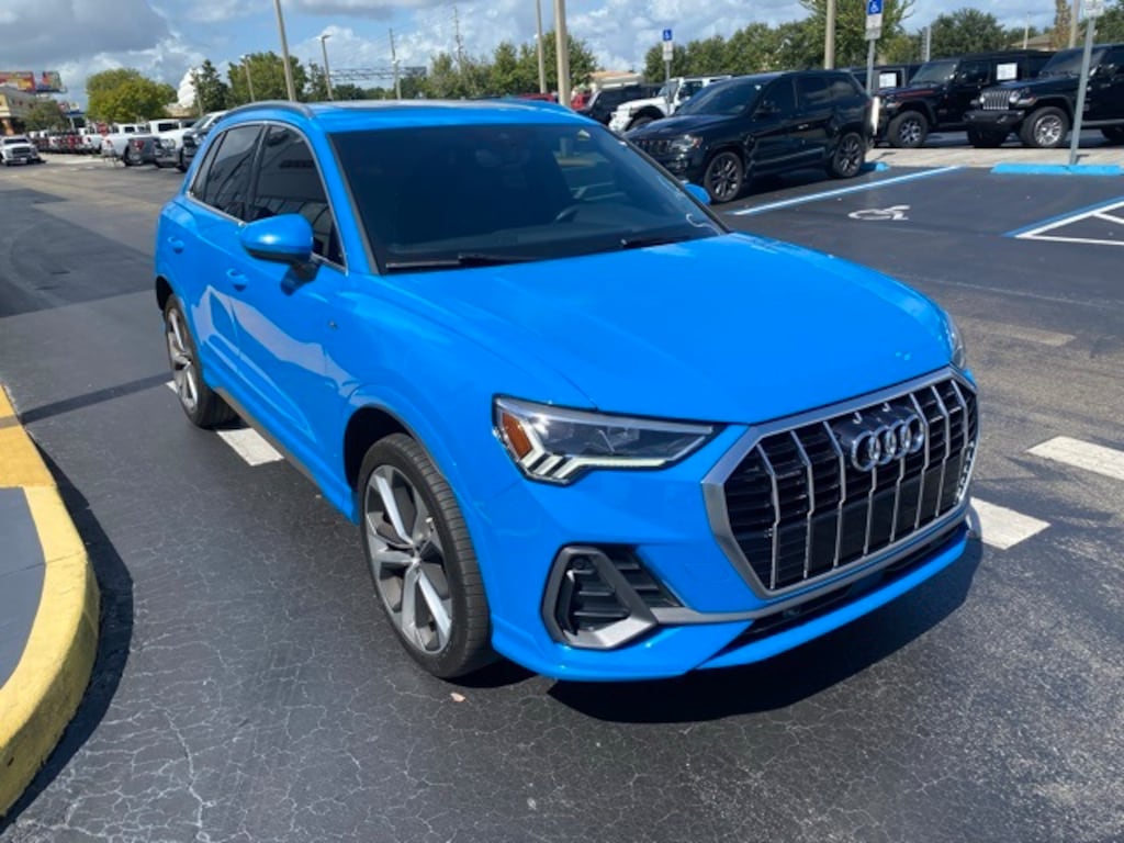 This Q3 is well equipped with 20" Wheel Package (Wheels: 20" 5-Twin-Spoke Module Design), Navigation Package, Premium Plus Package (8-Way Power Driver & Passenger Seat, Audi Phone Box w/Wireless Charging, Auto-Dimming Rear-View Mirror w/Compass, and LED Interior Lighting), Sport Interior Package, 10 Speakers, 3.533 Axle Ratio, 4-Wheel Disc Brakes, ABS brakes, Air Conditioning, Alloy wheels, AM/FM radio, Audi Beam-Rings, Audi Guard Protection Kit, Audi smartphone interface (Apple CarPlay/Android Auto), Auto High-beam Headlights, Automatic temperature control, Bang & Olufsen 3D Sound System, Brake assist, Bumpers: body-color, Delay-off headlights, Driver door bin, Driver vanity mirror, Dual front impact airbags, Dual front side impact airbags, Electronic Stability Control, Exterior Parking Camera Rear, Four wheel independent suspension, Front anti-roll bar, Front Bucket Seats, Front Center Armrest, Front dual zone A/C, Front fog lights, Front reading lights, Fully automatic headlights, Heated door mirrors, Heated Front Bucket Seats, Heated front seats, Illuminated entry, Knee airbag, Leather Seating Surfaces, Leather Shift Knob, Leather steering wheel, Low tire pressure warning, Occupant sensing airbag, Outside temperature display, Overhead airbag, Overhead console, Panic alarm, Passenger door bin, Passenger vanity mirror, Power door mirrors, Power driver seat, Power Liftgate, Power moonroof, Power steering, Power windows, Radio data system, Radio: Audi Sound System, Rain sensing wipers, Rear air conditioning, Rear anti-roll bar, Rear fog lights, Rear reading lights, Rear seat center armrest, Rear window defroster, Rear window wiper, Remote keyless entry, Speed control, Speed-sensing steering, Split folding rear seat, Spoiler, Stainless Steel Pedal Caps, Steering wheel mounted audio controls, Tachometer, Telescoping steering wheel, Tilt steering wheel, Traction control, Trip computer, Turn signal indicator mirrors, Variably intermittent wipers, and Wheels: 19" 5-Twin-Spoke Dynamic Design.
