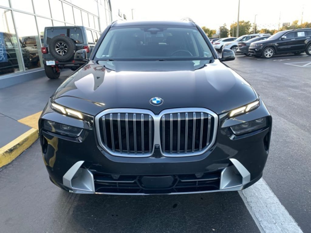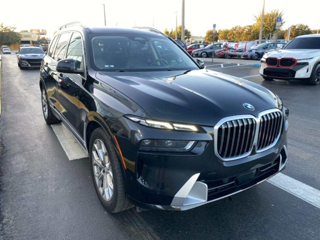 This X7 is well equipped with Connected Package Pro, 10 Speakers, 3.64 Axle Ratio, 3rd row seats: split-bench, 4-Wheel Disc Brakes, ABS brakes, Adaptive suspension, Air Conditioning, Alloy wheels, AM/FM radio: SiriusXM, AM/FM Stereo, Apple CarPlay & Android Auto Compatibility, Apple CarPlay Compatibility, Auto High-beam Headlights, Auto tilt-away steering wheel, Auto-dimming door mirrors, Auto-dimming Rear-View mirror, Auto-leveling suspension, Automatic temperature control, BMW Assist eCall, BMW TeleServices, Brake assist, Bumpers: body-color, Compass, ConnectedDrive Services, Delay-off headlights, Driver door bin, Driver vanity mirror, Dual front impact airbags, Dual front side impact airbags, Electronic Stability Control, Emergency communication system: BMW Assist eCall, Exterior Parking Camera Rear, Four wheel independent suspension, Front anti-roll bar, Front Bucket Seats, Front Center Armrest, Front dual zone A/C, Front reading lights, Fully automatic headlights, Garage door transmitter, Genuine wood console insert, Genuine wood dashboard insert, Genuine wood door panel insert, Head restraints memory, Heads-Up Display, Heated door mirrors, Heated front seats, Heated Multi-Contour Seats, Heated steering wheel, Hi-Fi Sound System, Illuminated entry, Knee airbag, Live Cockpit Pro w/Navi, Low tire pressure warning, Memory seat, Navigation system: BMW Maps Navigation, Occupant sensing airbag, Outside temperature display, Overhead airbag, Panic alarm, Passenger door bin, Passenger vanity mirror, Personal eSIM 5G, Power adjustable front head restraints, Power door mirrors, Power driver seat, Power Front Seats, Power moonroof: Panorama, Power passenger seat, Power steering, Power windows, Radio data system, Rain sensing wipers, Rear air conditioning, Rear anti-roll bar, Rear dual zone A/C, Rear reading lights, Rear seat center armrest, Rear window defroster, Rear window wiper, Reclining 3rd row seat, Remote keyless entry, Security system, Sensafin Upholstery, SiriusXM Satellite Radio, Speed control, Speed-sensing steering, Speed-Sensitive Wipers, Split folding rear seat, Spoiler, Sport steering wheel, Steering wheel memory, Steering wheel mounted audio controls, Tachometer, Telescoping steering wheel, Tilt steering wheel, Traction control, Trip computer, Turn signal indicator mirrors, Variably intermittent wipers, Wheels: 21" x 9.5" Y-Spoke Bi-Color, and Wireless Charging Device.