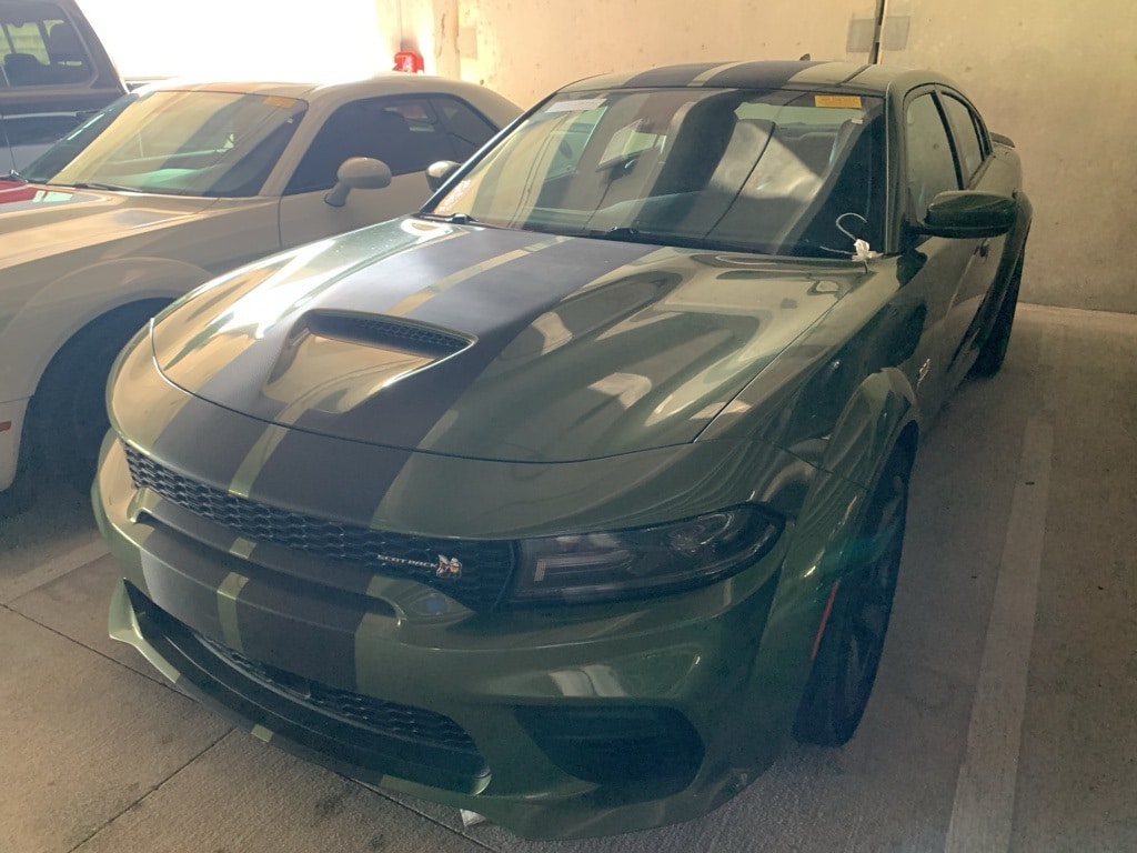 This Charger is well equipped with Driver Convenience Group (Bi-Function HID Projector Head Lamps), harman/kardon Audio Group (19 harman/kardon GreenEdge Speakers, Surround Sound, and harman/kardon GreenEdge Amp), Navigation & Travel Group (Radio: Uconnect 4C Nav w/8.4" Display, 5-Year SiriusXM Traffic Service, 5-Year SiriusXM Travel Link Service, SiriusXM Traffic Plus, and SiriusXM Travel Link), Plus Group (Blind Spot & Cross Path Detection, Blind Spot Memory/Power/Heat Mirror, Heated 2nd Row Seats, Power Front Driver/Passenger Seats, Auto Adjust In Reverse Exterior Mirrors, Auto-Dimming Exterior Driver Mirror, Black-Edged Premium Floormats, Driver & Passenger Lower LED Lamps, Exterior Mirrors Courtesy Lamps, Front Overhead LED Lighting, Illuminated Rear Cupholders, Power Driver/Passenger 4-Way Lumbar Adjust, Power Tilt/Telescope Steering Column, Premium-Stitched Dash Panel, Radio/Driver Seat/Mirrors Memory, Rear Seat Armrest w/Storage Cupholder, Scat Pack Logo Nappa/Alcantara Seat, and Ventilated Front Seats), Technology Group (Adaptive Cruise Control w/Stop, Advanced Brake Assist, Full Speed FWD Collision Warn Plus, Lane Departure Warning Plus, Auto High Beam Headlamp Control, and Rain Sensitive Windshield Wipers), Widebody Package, Quick Order Package 21V Scat Pack Widebody (Widebody Competition Suspension, Adaptive Damping Suspension, All Speed Traction Control, Body Color Fender Flares, Brembo 6-Pot Fixed Front Caliper Brakes, Flat-Bottom Steering Wheel, Performance Shift Indicator, and Wheels: 20" x 11" Devil's Rim Aluminum), Black Artificial Leather, Apple CarPlay/Android Auto, Brake assist, ParkView Rear Back-Up Camera, 4-Wheel Disc Brakes, 6 Speakers, ABS brakes, Air Conditioning, Alloy wheels, AM/FM radio: SiriusXM, Anti-whiplash front head restraints, Auto-dimming Rear-View mirror, Automatic temperature control, Bumpers: body-color, Cloth Performance Seats w/Bee Logo, Compass, Delay-off headlights, Driver door bin, Driver vanity mirror, Dual Carbon Stripes, Dual front impact airbags, Dual front side impact airbags, Electronic Stability Control, Emergency communication system: SiriusXM Guardian, Four wheel independent suspension, Front anti-roll bar, Front Bucket Seats, Front Center Armrest, Front dual zone A/C, Front fog lights, Front reading lights, Fully automatic headlights, Garage door transmitter: HomeLink, Heated door mirrors, Heated front seats, Heated steering wheel, Illuminated entry, Knee airbag, Leather Shift Knob, Low tire pressure warning, Manufacturer's Statement of Origin, Occupant sensing airbag, Outside temperature display, Overhead airbag, Overhead console, Panic alarm, Passenger door bin, Passenger vanity mirror, Power door mirrors, Power driver seat, Power steering, Power windows, Radio data system, Radio: Uconnect 4C w/8.4" Display, Rear anti-roll bar, Rear reading lights, Rear seat center armrest, Rear window defroster, Remote keyless entry, Security system, Speed control, Speed-Sensitive Wipers, Split folding rear seat, Spoiler, Sport steering wheel, Steering wheel mounted audio controls, Tachometer, Telescoping steering wheel, Tilt steering wheel, Traction control, Trip computer, Variably