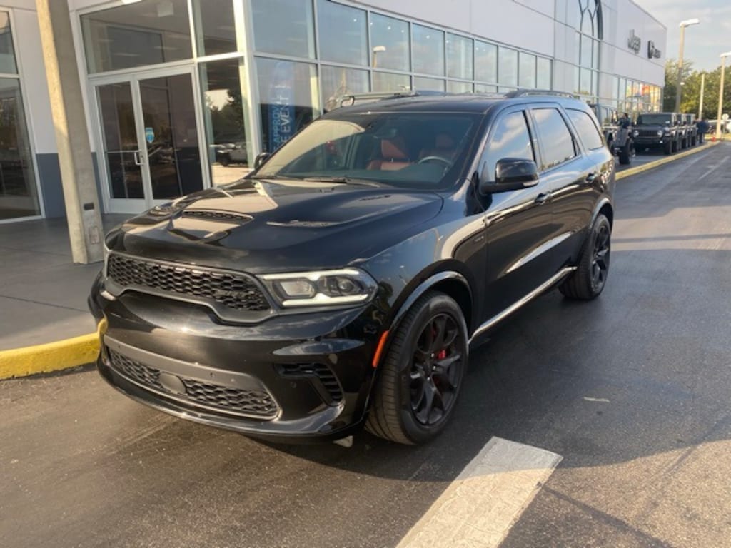 This Durango is well equipped with Black Package (Eclipse Black Exhaust Tips, Gray Metallic Badges, Satin Black Dodge Tail Lamp Badge, and Wheels: 20" x 10" Lights Out Aluminum), Quick Order Package 29M SRT 392 Plus (7 & 4 Pin Wiring Harness, Adaptive Cruise Control w/Stop, Advanced Brake Assist, Black Roof Rails, Blind Spot w/Trailer Detection, Class IV Receiver Hitch, Full Speed Forward Collision Warning Plus, High Performance Laguna Leather Seats, Integrated Roof Rail Crossbars, Lane Departure Warning Plus, and Power Sunroof), 2nd Row Mini Console w/Cupholders, 3.70 Rear Axle Ratio, 3rd Row Floor Mat & Mini Console, 3rd row seats: split-bench, 4-Wheel Disc Brakes, 9 Speakers, ABS brakes, Adaptive suspension, Air Conditioning, Alloy wheels, AM/FM radio: SiriusXM w/360L, Apple CarPlay/Android Auto, Audio memory, Auto High-beam Headlights, Auto-dimming door mirrors, Auto-dimming Rear-View mirror, Automatic temperature control, Brake assist, Bumpers: body-color, Compass, Delay-off headlights, Driver door bin, Driver vanity mirror, Dual front impact airbags, Dual front side impact airbags, Electronic Stability Control, Emergency communication system, Four wheel independent suspension, Front anti-roll bar, Front Bucket Seats, Front Center Armrest w/Storage, Front dual zone A/C, Front reading lights, Fully automatic headlights, Garage door transmitter, Gloss Black Exterior Mirrors, Heated door mirrors, Heated front seats, Heated rear seats, Heated steering wheel, Illuminated entry, Knee airbag, Leather Shift Knob, Leather steering wheel, Leather Trimmed Bucket Seats, Low tire pressure warning, Memory seat, MOPAR Dual Stripes- Bright Blue, Navigation system: TomTom, Occupant sensing airbag, Outside temperature display, Overhead airbag, Overhead console, Panic alarm, ParkView Rear Back-Up Camera, Passenger door bin, Passenger vanity mirror, Power door mirrors, Power driver seat, Power Liftgate, Power passenger seat, Power steering, Power windows, Radio data system, Radio: Uconnect 5 Nav w/10.1" Display, Rain sensing wipers, Rear air conditioning, Rear anti-roll bar, Rear reading lights, Rear window defroster, Rear window wiper, Remote keyless entry, Security system, Speed control, Speed-sensing steering, Speed-Sensitive Wipers, Split folding rear seat, Spoiler, Sport steering wheel, Steering wheel mounted audio controls, Tachometer, Telescoping steering wheel, Tilt steering wheel, Traction control, Trip computer, Turn signal indicator mirrors, Variably intermittent wipers, Ventilated front seats, Voltmeter, and Wheels: 20" x 10" Hyper Black Aluminum.