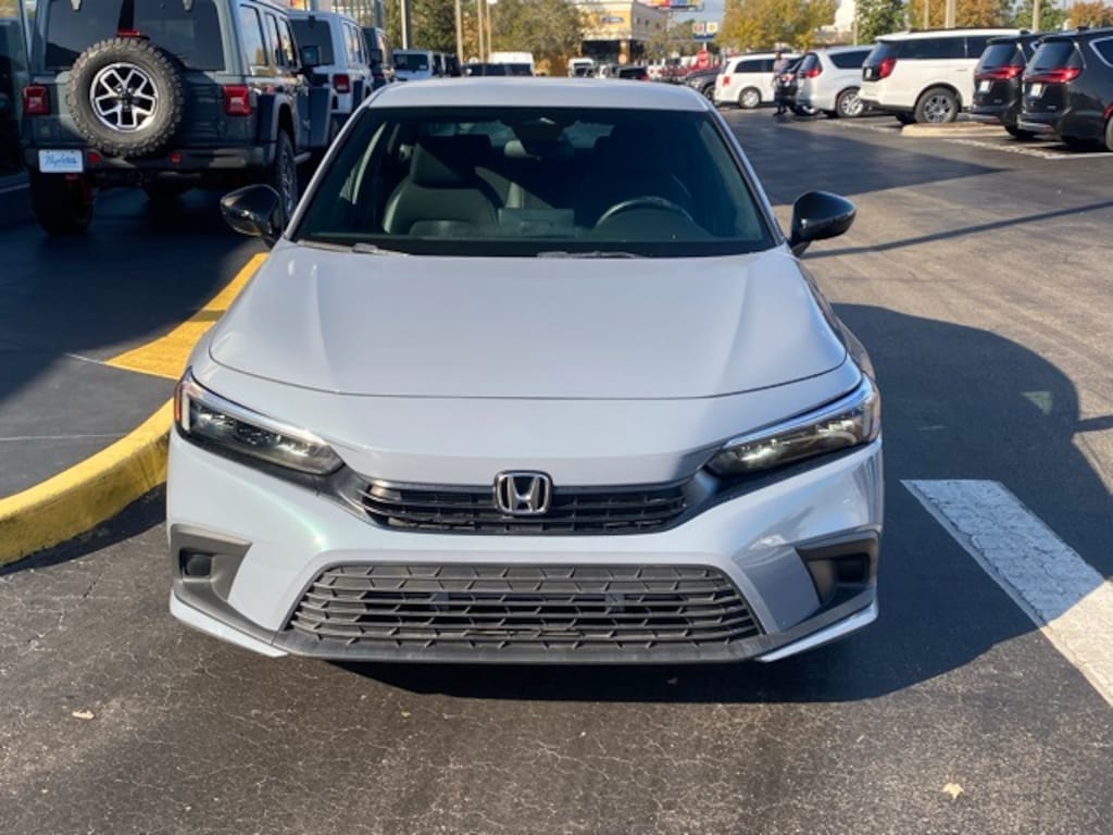 This Civic is well equipped with 4-Wheel Disc Brakes, 8 Speakers, ABS brakes, Adaptive Cruise Control: Adaptive Cruise Control (ACC) with Low-Speed Follow, Air Conditioning, Alloy wheels, AM/FM radio, Apple CarPlay/Android Auto, Auto High-beam Headlights, Automatic temperature control, Brake assist, Bumpers: body-color, Cloth/Leatherette Seating Surfaces, Delay-off headlights, Driver door bin, Driver vanity mirror, Dual front impact airbags, Dual front side impact airbags, Electronic Stability Control, Emergency communication system: HondaLink, Exterior Parking Camera Rear, Four wheel independent suspension, Front anti-roll bar, Front Bucket Seats, Front Center Armrest, Front reading lights, Fully automatic headlights, Illuminated entry, Knee airbag, Leather Shift Knob, Leather steering wheel, Low tire pressure warning, Occupant sensing airbag, Outside temperature display, Overhead airbag, Panic alarm, Passenger door bin, Passenger vanity mirror, Power door mirrors, Power steering, Power windows, Radio data system, Radio: 180-Watt Audio System, Rear anti-roll bar, Rear side impact airbag, Rear window defroster, Remote keyless entry, Security system, Speed control, Speed-sensing steering, Steering wheel mounted audio controls, Tachometer, Telescoping steering wheel, Tilt steering wheel, Traction control, Trip computer, and Wheels: 18" Gloss Black Alloy.