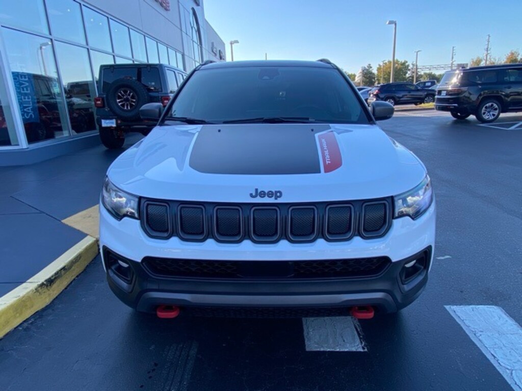 This Compass is well equipped with Quick Order Package 2GE, Sun and Sound Group (Power Front/Fixed Rear Full Sunroof and Premium Alpine Speaker System), Trailhawk Convenience Group (115V Auxiliary Power Outlet, 2nd Row USB Type A/C Charge Only, Heated Front Seats, Leather Wrapped Steering Wheel, Power 2-Way Driver Lumbar Adjust, Power Adjust 8-Way Driver Seat, Remote Start System, Reversible Carpet/Vinyl Cargo Mat, Vehicle Information Center, and Windshield Wiper De-Icer), 10.1" Touchscreen Display, 4-Wheel Disc Brakes, 4.334 Axle Ratio, 6 Speakers, ABS brakes, Air Conditioning, Alloy wheels, AM/FM radio: SiriusXM, Anti-whiplash front head restraints, Auto High-beam Headlights, Auto-dimming Rear-View mirror, Automatic temperature control, Brake assist, Bumpers: body-color, Compass, Delay-off headlights, Disassociated Touchscreen Display, Driver door bin, Driver vanity mirror, Dual front impact airbags, Dual front side impact airbags, Electronic Stability Control, Emergency communication system: SiriusXM Guardian, Four wheel independent suspension, Front anti-roll bar, Front Bucket Seats, Front Center Armrest w/Storage, Front dual zone A/C, Front fog lights, Front reading lights, Fully automatic headlights, Global Telematics Box Module (TBM), Heated door mirrors, Illuminated entry, Knee airbag, Leather Shift Knob, Low tire pressure warning, Occupant sensing airbag, Outside temperature display, Overhead airbag, Overhead console, Panic alarm, ParkView Rear Back-Up Camera, Passenger door bin, Passenger vanity mirror, Power door mirrors, Power steering, Power windows, Premium Cloth/Leather Trim Bucket Seats, Radio: Uconnect 5 w/10.1" Display, Rain sensing wipers, Rear anti-roll bar, Rear seat center armrest, Rear window defroster, Rear window wiper, Remote keyless entry, Roof rack: rails only, Security system, Speed control, Split folding rear seat, Spoiler, Steering wheel mounted audio controls, Tachometer, Telescoping steering wheel, Tilt steering wheel, Traction control, Trip computer, Turn signal indicator mirrors, Variably intermittent wipers, and Wheels: 17" x 6.5" Painted Diamond Cut Aluminum.