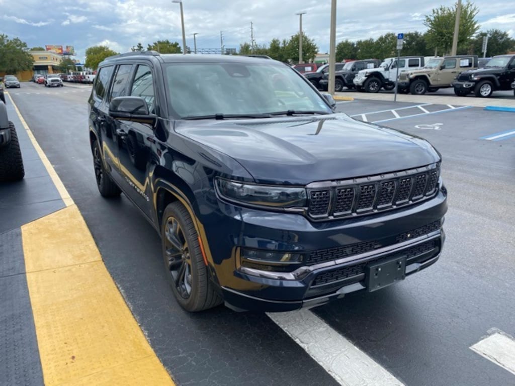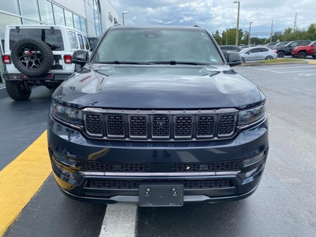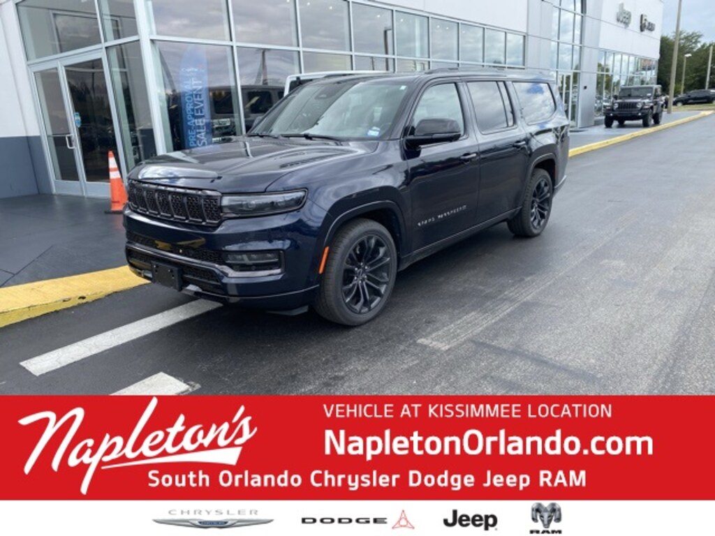 This Grand Wagoneer L is well equipped with Obsidian Appearance Package, Quick Order Package 28T Obsidian (23 Speaker McIntosh Reference Audio System, Adjustable Roof Rail Crossbars, Black Interior Accents, Black Roof, Front Console Cooler, Front Passenger Interactive Display, Gloss Black Upper & Lower DLO Molding, Piano Black Exterior Accents, Rearview Autodim Digital Display Mirror, Ventilated Rear Seats, and Wheels: 22" x 9.0" Tinted Polished w/Black Insert), Two Tone Paint Group, 19 Speakers, 3rd row seats: bench, 4-Wheel Disc Brakes, ABS brakes, Adjustable pedals, Air Conditioning, Alloy wheels, AM/FM radio: SiriusXM with 360L, Anti-whiplash front head restraints, Apple CarPlay/Android Auto, Audio memory, Auto High-beam Headlights, Auto-dimming door mirrors, Auto-dimming Rear-View mirror, Auto-leveling suspension, Automatic temperature control, Brake assist, Bumpers: body-color, Compass, Delay-off headlights, Driver door bin, Driver vanity mirror, Driver's Seat Mounted Armrest, Dual front impact airbags, Dual front side impact airbags, Electronic Stability Control, Emergency communication system, Four wheel independent suspension, Front anti-roll bar, Front Bucket Seats, Front Center Armrest w/Storage, Front dual zone A/C, Front fog lights, Front reading lights, Fully automatic headlights, Garage door transmitter, Genuine wood console insert, Genuine wood dashboard insert, Genuine wood door panel insert, Heads-Up Display, Heated door mirrors, Heated front seats, Heated rear seats, Heated steering wheel, Illuminated entry, Knee airbag, Leather steering wheel, Leather Trimmed Bucket Seats, Low tire pressure warning, Memory seat, Navigation System, Normal Duty Suspension, Occupant sensing airbag, Outside temperature display, Overhead airbag, Overhead console, Panic alarm, Passenger door bin, Passenger seat mounted armrest, Passenger vanity mirror, Pedal memory, Power adjustable front head restraints, Power door mirrors, Power driver seat, Power Liftgate, Power moonroof, Power passenger seat, Power steering, Power windows, Radio data system, Radio: Uconnect 5 Nav w/12.0" Display, Rain sensing wipers, Rear air conditioning, Rear anti-roll bar, Rear dual zone A/C, Rear reading lights, Rear seat center armrest, Rear window defroster, Rear window wiper, Reclining 3rd row seat, Remote keyless entry, Security system, Speed control, Speed-sensing steering, Speed-Sensitive Wipers, Split folding rear seat, Steering wheel memory, Steering wheel mounted audio controls, Tachometer, Telescoping steering wheel, Tilt steering wheel, Traction control, Trip computer, Turn signal indicator mirrors, Variably intermittent wipers, Ventilated front seats, and Voltmeter.
