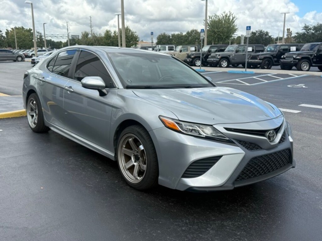 This Camry is well equipped with 4-Wheel Disc Brakes, 6 Speakers, ABS brakes, Air Conditioning, Alloy wheels, AM/FM radio: SiriusXM, Apple CarPlay/Android Auto, Auto High-beam Headlights, Automatic temperature control, Brake assist, Bumpers: body-color, Delay-off headlights, Driver door bin, Driver vanity mirror, Dual front impact airbags, Dual front side impact airbags, Electronic Stability Control, Emergency communication system: Safety Connect with 1-year trial, Exterior Parking Camera Rear, Fabric Seat Trim w/SofTex, Four wheel independent suspension, Front anti-roll bar, Front Bucket Seats, Front Center Armrest, Front reading lights, Front Sport Bucket Seats, Fully automatic headlights, Illuminated entry, Knee airbag, Leather Shift Knob, Low tire pressure warning, Occupant sensing airbag, Outside temperature display, Overhead airbag, Overhead console, Panic alarm, Passenger door bin, Passenger vanity mirror, Power door mirrors, Power driver seat, Power steering, Power windows, Radio data system, Radio: AM/FM Audio System, Rear anti-roll bar, Rear reading lights, Rear seat center armrest, Rear side impact airbag, Rear window defroster, Remote keyless entry, Security system, Speed control, Speed-sensing steering, Split folding rear seat, Spoiler, Sport steering wheel, Steering wheel mounted audio controls, Tachometer, Telescoping steering wheel, Tilt steering wheel, Traction control, Trip computer, Variably intermittent wipers, and Wheels: 8.0J x 18" Black Machined-Finish Alloy.