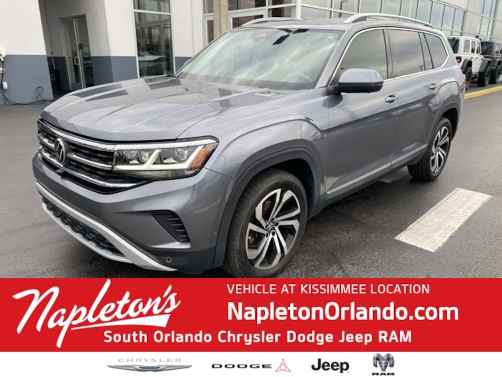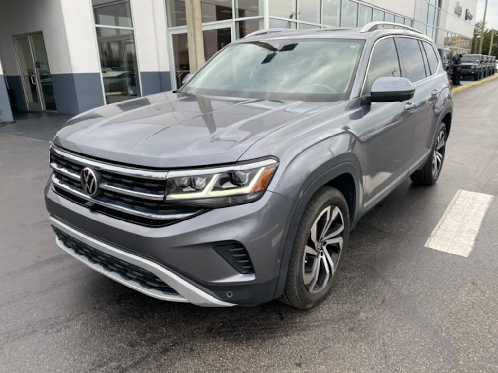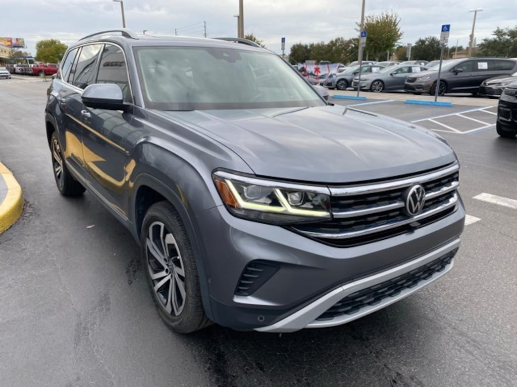 This Atlas is well equipped with 12 Speakers, 2nd-Row Dual Captain's Chairs, 3.60 Axle Ratio, 3rd row seats: split-bench, 4-Wheel Disc Brakes, ABS brakes, Air Conditioning, Alloy wheels, Auto High-beam Headlights, Auto-dimming Rear-View mirror, Automatic temperature control, Brake assist, Bumpers: body-color, Compass, Delay-off headlights, Driver door bin, Driver vanity mirror, Dual front impact airbags, Dual front side impact airbags, Electronic Stability Control, Emergency communication system: VW Car-Net services (capabilities require enrollment or subscription), Four wheel independent suspension, Frameless Self-Dimming Rearview Mirror, Front anti-roll bar, Front Bucket Seats, Front Center Armrest, Front dual zone A/C, Front fog lights, Front reading lights, Fully automatic headlights, Heated door mirrors, Heated front seats, Heated rear seats, Heated steering wheel, Heavy Duty Trunk Liner w/VW CarGo Blocks, Htd/Actively Ventilated Comfort Front Sport Seats, Illuminated entry, Leather Shift Knob, Low tire pressure warning, Memory seat, Navigation System, Occupant sensing airbag, Outside temperature display, Overhead airbag, Overhead console, Panic alarm, Passenger door bin, Passenger vanity mirror, Perforated Vienna Leather Seating Surfaces, Power door mirrors, Power driver seat, Power Liftgate, Power moonroof, Power passenger seat, Power steering, Power windows, Privacy Cover, Radio data system, Rain sensing wipers, Rear air conditioning, Rear anti-roll bar, Rear audio controls, Rear reading lights, Rear seat center armrest, Rear window defroster, Rear window wiper, Remote keyless entry, Roof rack: rails only, Rubber Mats Kit - Captain's Chairs, Security system, Speed control, Speed-sensing steering, Split folding rear seat, Spoiler, Standard Suspension, Steering wheel mounted audio controls, Tachometer, Telescoping steering wheel, Tilt steering wheel, Traction control, Trip computer, Turn signal indicator mirrors, Variably intermittent wipers, Ventilated front seats, VW Care, and Wheels: 20" 5-Spoke 2-Tone Machined Alloy.